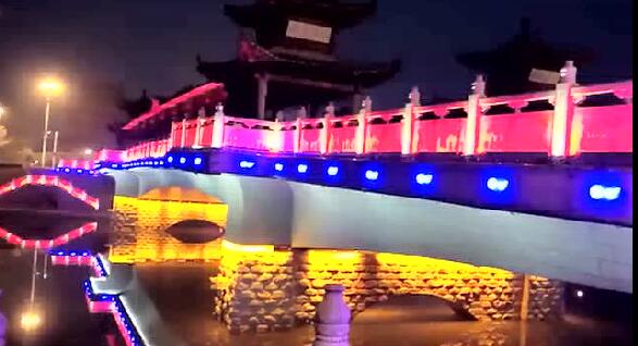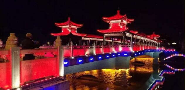 太平橋用隱藏式的瓦楞投光燈照亮建筑屋面,變幻四季顏色,絢麗多彩,形成一定的韻律感,河中倒影給人波光粼粼的勝境,整體氣勢恢弘,在橋的欄桿下一側用定制的祥云圖案燈順序排列,寓意祥和、太平,突出太平盛世文化。