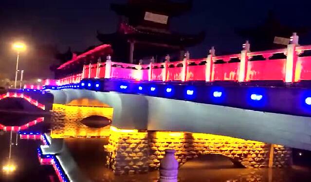 太平橋用隱藏式的瓦楞投光燈照亮建筑屋面,變幻四季顏色,絢麗多彩,形成一定的韻律感,河中倒影給人波光粼粼的勝境,整體氣勢(shì)恢弘,在橋的欄桿下一側(cè)用定制的祥云圖案燈順序排列,寓意祥和、太平,突出太平盛世文化。